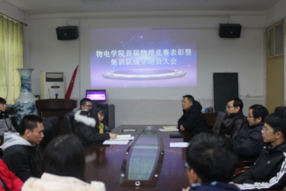 beat365首届物理竞赛自2017年12月17日下午在八教1-1举办比赛、25日角出刘大东等28名优秀同学,到此已完美收官。2018年1月5日上午10:00在物理楼二楼会议室举行了竞赛表彰暨集训队成立动员大会。出席大会的有副院长刘明伟、院党委副书记杜鑫、院实验中心主任何雄辉老师、院创新创业实践中心谭长海老师和学工办孙婵老师。本次会议由孙婵老师主持。