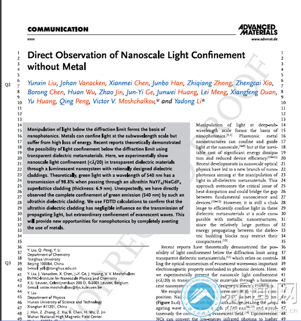 12月13日,我校beat365官方网站刘云新副教授在国际权威期刊《先进材料》(Advanced Materials,影响因子21.95)杂志上发表一篇题为《Direct observation of nanoscale light confinement without metal(纳米尺度光约束的直接观测)》论文。该研究前期相关研究成果在2013年发表《Angew. Chem. Int. Ed.》(影响因子:13.734)上,入选ESI前1%高被引论文。
