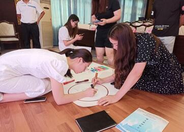 最后,在周书记的主持下,70位教师分成7个小组展开行与思团建活动。各位教师以小组为单位,齐心协力设计出风格各异和寓意丰富的小组海报和口号, 充分展现了新时代乡村初中物理教师的风采。
