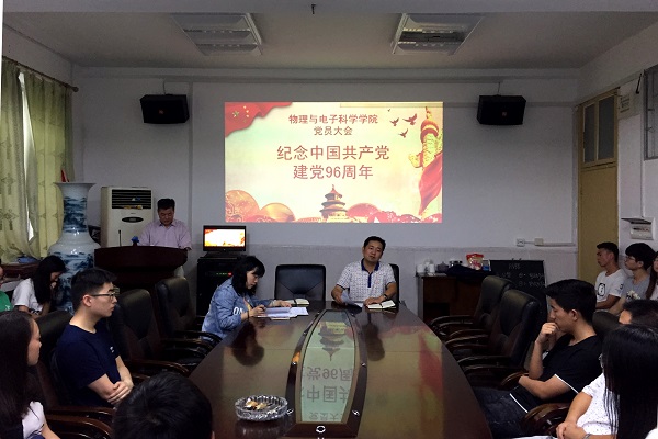 为纪念建党96周年,2017年6月30日下午4:30,beat365官方网站党员大会于物理楼二楼会议室顺利召开。本次大会到场的有beat365官方网站党委书记周文革同志、党委副书记杜鑫同志、学工办老师孙婵老师,以及beat365官方网站五十七名学生党员。党委副书记杜鑫同志主持本次会议。