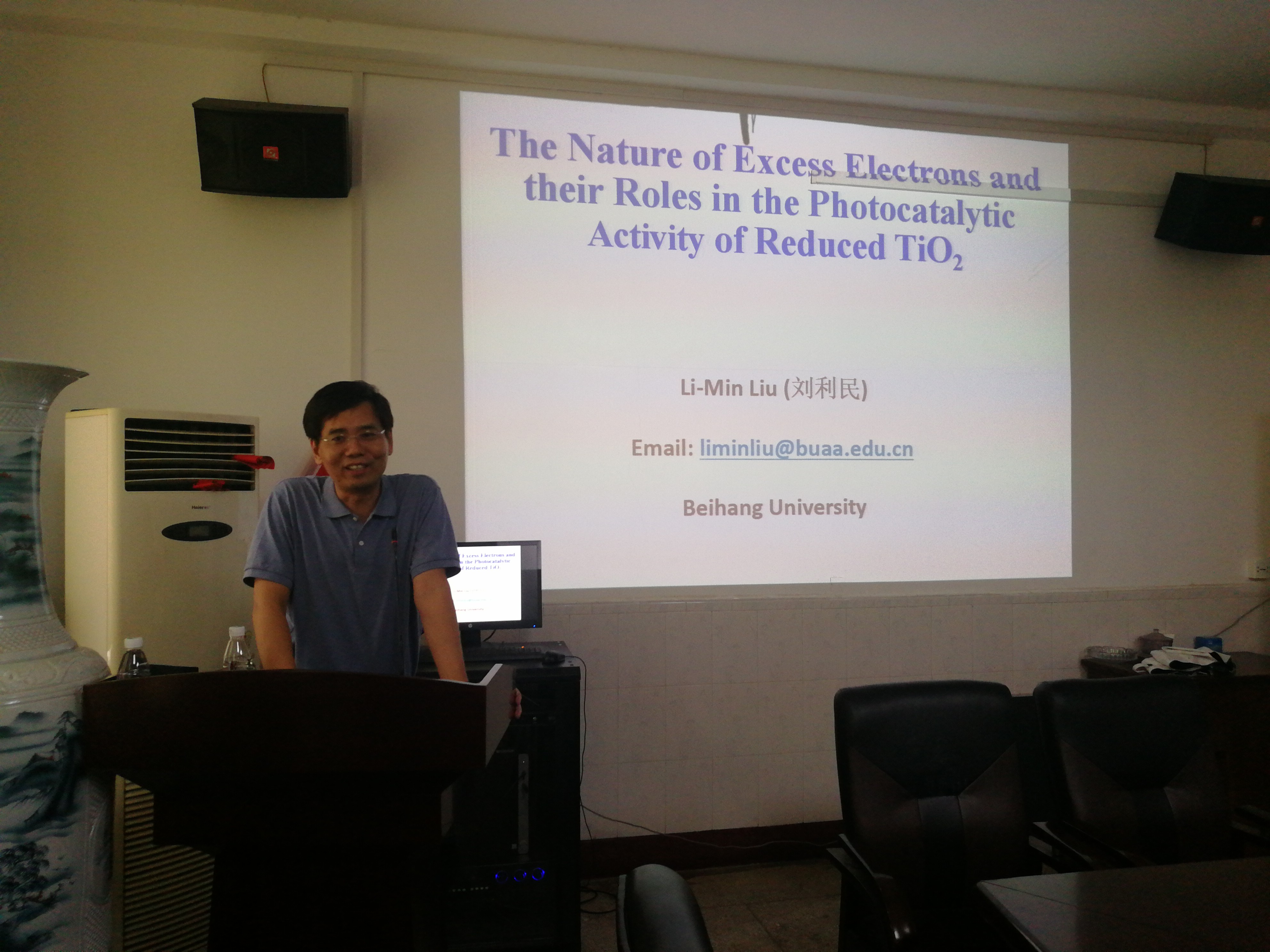 9月14日下午14:30,国家优秀青年科学基金获得者、中组部“青年千人计划”入选者、北京航空航天大学物理学院刘利民研究员,应邀在beat365物理楼213作了关于“二氧化钛光催化活性的影响”的学术报告。beat365部分教师以及全体研究生参加此次报告会。
