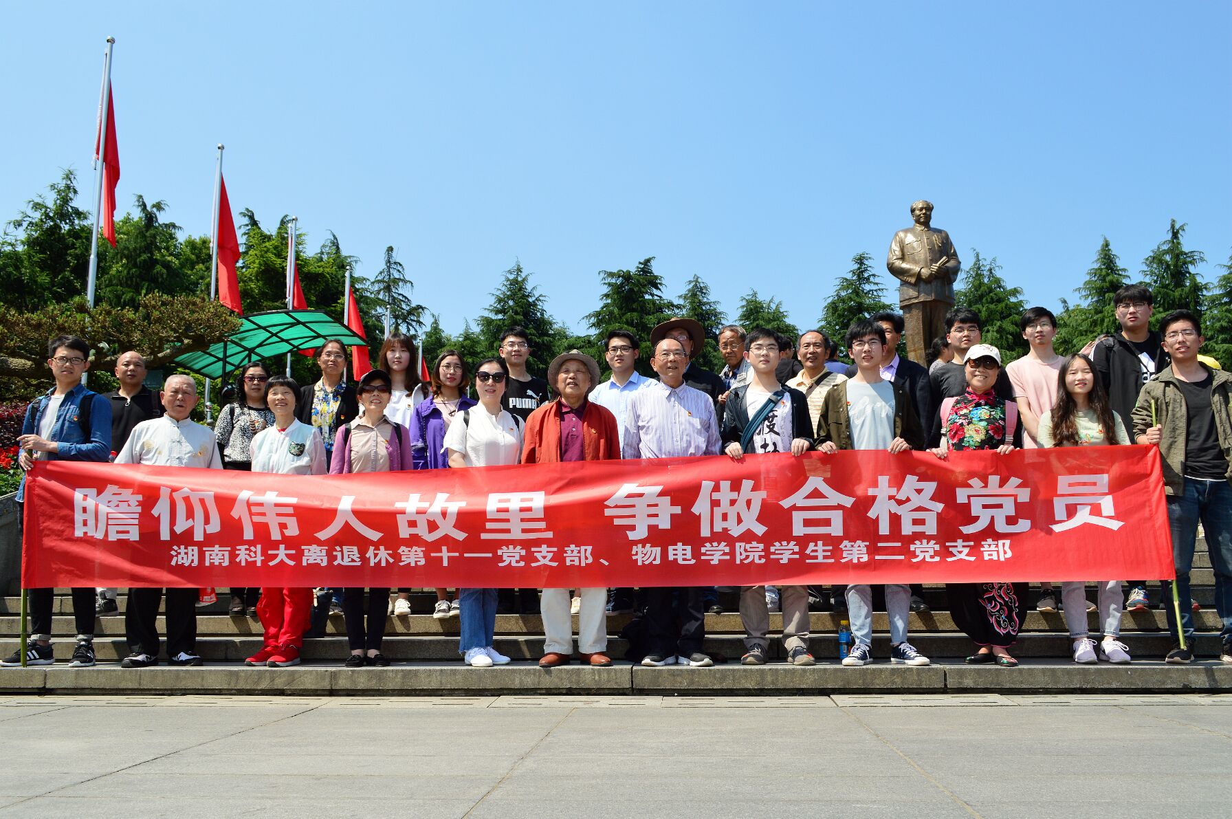 为庆祝中华人民共和国成立70周年,扎实开展“两学一做”教育实践活动,有力推进党组织“五化”建设,5月11日,beat365官方网站组织学生第二党支部与校离退休第十一党支部前往韶山开展主题为“瞻仰伟人故里,争做合格党员”的联合党日活动。